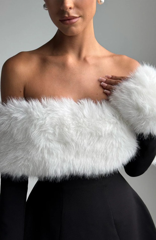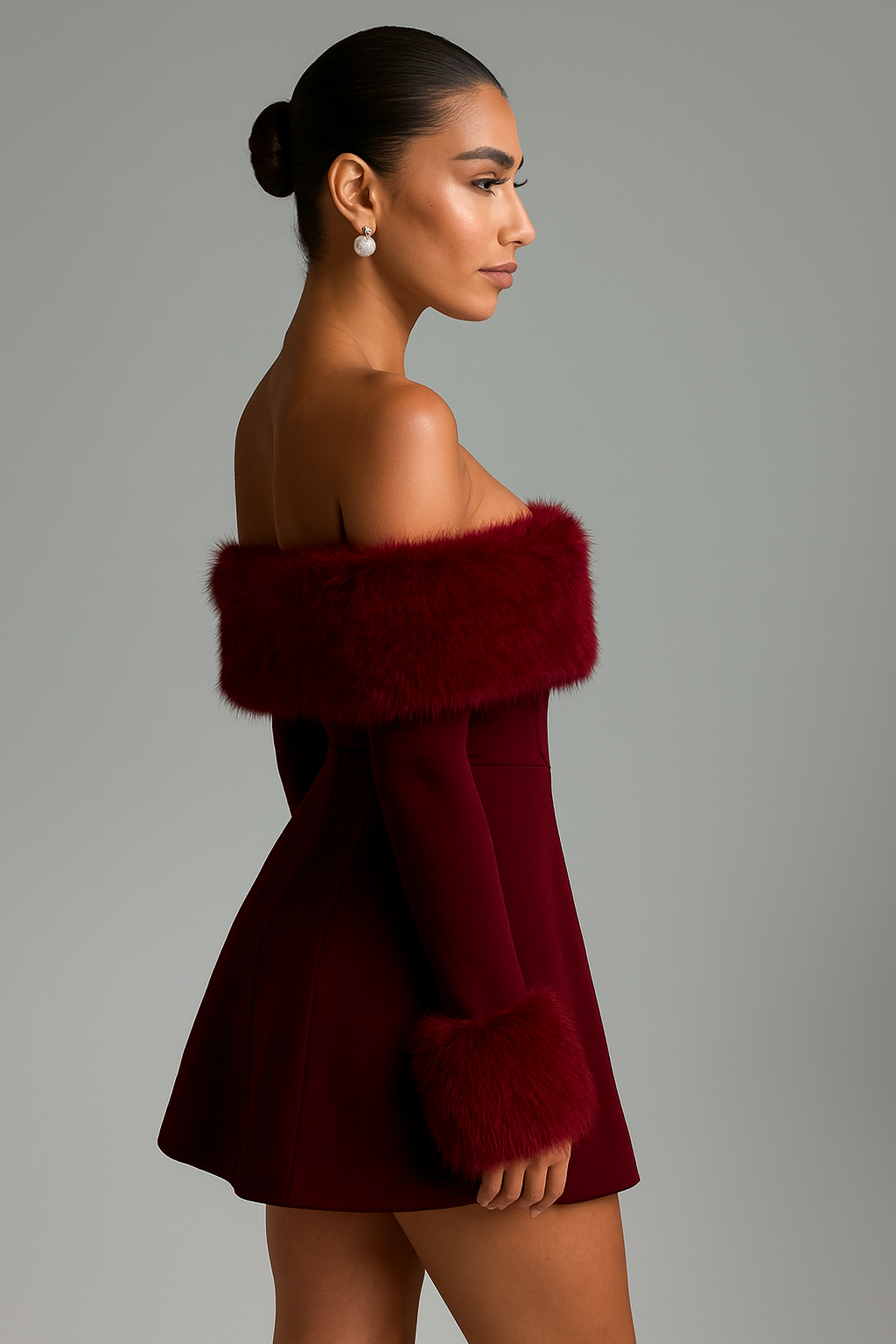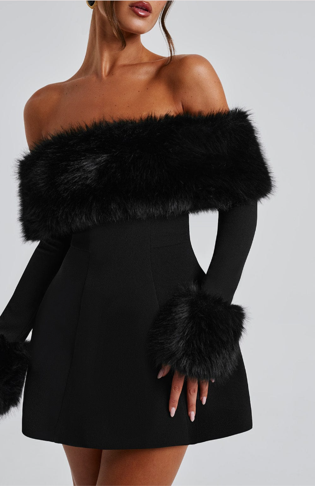 Introducing our cutest, cosiest design of the season, Giselle. Made with plush faux fur trimmed neckline and cuffs, the mini dress has long sleeves and a playful bubble shaped skirt.